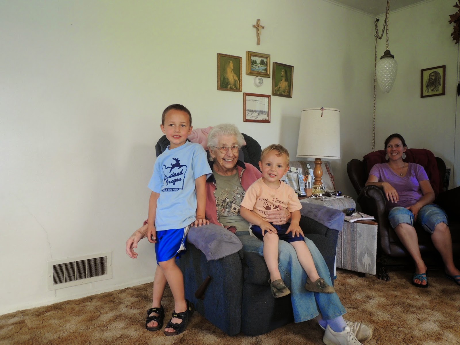 But I had kids to entertain and a garden to keep up with. That morning, I had gone through some of my Grammy's jewelry that dad just brought out, and put a necklace and bracelet of hers on. I thought of her while they were clanging around, and then I rolled out the rug that was in her house. I started to feel better, and so Tyler took a photo of Cash and I getting into a better mood (well, I guess it was just ME needing to be in a better mood).